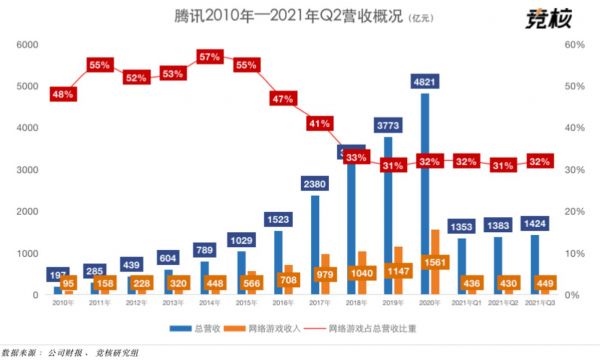 11月10日,腾讯公布2021年第三季度财报。财报显示,Q3期间腾讯总营收为1424亿元,同比增长13%,环比增长3%。