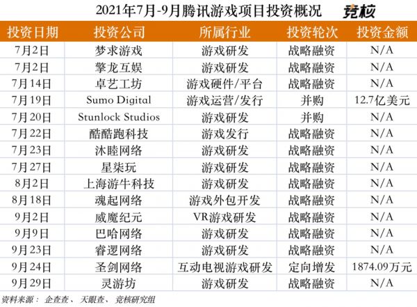 笔者整理天眼查、企查查相关资料了解到,7月-9月,腾讯对外投资事件次数分别为30、24、21,共计约75起。其中与游戏相关的项目约有15个。