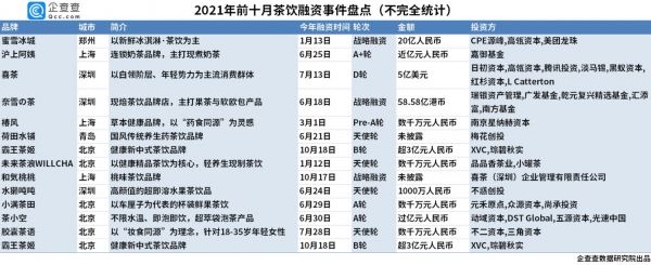 企查查数据显示,前十月蜜雪冰城、奈雪的茶、喜茶、沪上阿姨等较为知名的奶茶品牌获得融资,其中奈雪的茶获得58.58亿港元的战略投资,并于6月30日赴港上市;喜茶完成5亿美元的D轮融资;蜜雪冰城获得20亿元的战略投资,投资者有高瓴资本、美团龙珠等;沪上阿姨获得了一笔近亿元的A+轮融资,资本市场对知名品牌仍然信心十足。