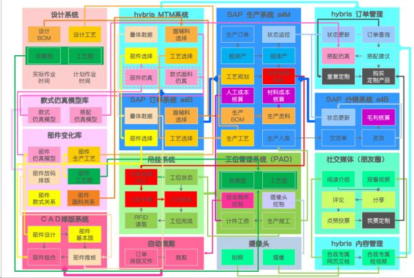 没有来自车间主任的生产计划,订单在ERP、PLM、智能CAD、吊挂系统、工位管理系统中自动处理和流转,指导着每一个工位的生产。