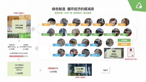 此外在实现双碳目标上,禾香板还有着更重要的意义。由于使用农林剩余物替代木材,不仅减少树木的砍伐,还减少了焚烧农林剩余物产生的二氧化碳。经广州能源所测算,每生产1立方米禾香板,可以减少碳排放量1.425吨。