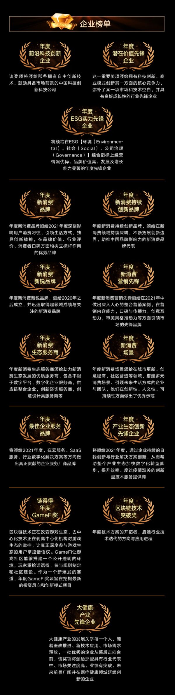 企业榜单将关注新消费、企业服务、大健康、区块链等热门行业,同时评选出“年度前沿科技创新企业”、“年度「潜在价值」先锋企业”、“年度 ESG 实力先锋企业”等专项奖项。