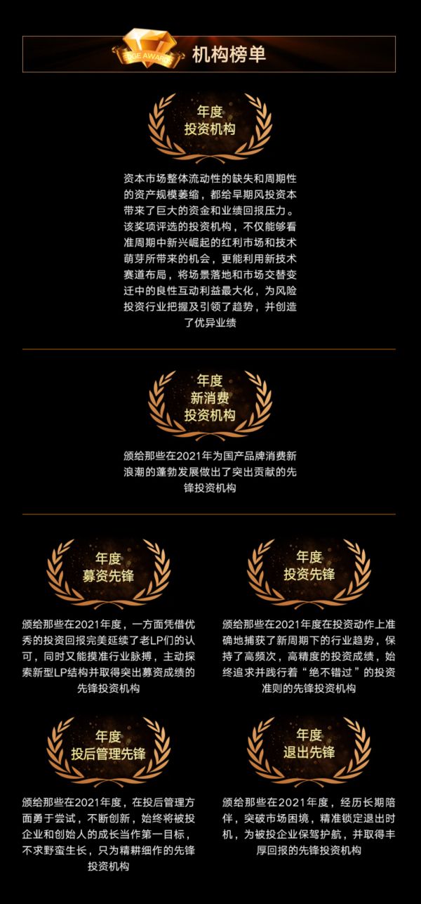 本届机构榜单将设立“年度投资机构”榜和“年度新消费投资机构”榜,同时根据“募投管退”四个维度,定向评选出“年度募资先锋”、“年度投资先锋”、“年度投后管理先锋”与“年度退出先锋”四大专项榜单。