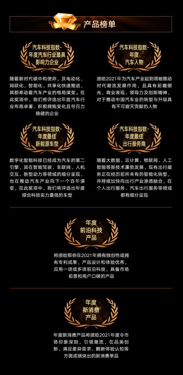 产品榜单将评选出年度前沿科技产品、年度新消费产品两大独立榜单。同时,本次产品榜单针对汽车行业将重磅发布“汽车科技指数”,下设“年度汽车行业最具影响力企业”、“年度汽车人物”、“年度最佳新能源车型”、“年度最佳出行服务商”四大榜单,呈现汽车行业全产业链的头部力量。