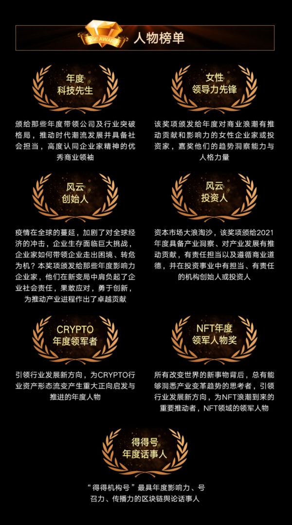 人物榜单则将评选出2021年“年度科技先生”、“女性领导力先锋”、“风云创始人”、“风云投资人”、“CRYPTO年度领军者”、“NFT年度领军人物奖”、“得得号年度话事人”等多项大奖。