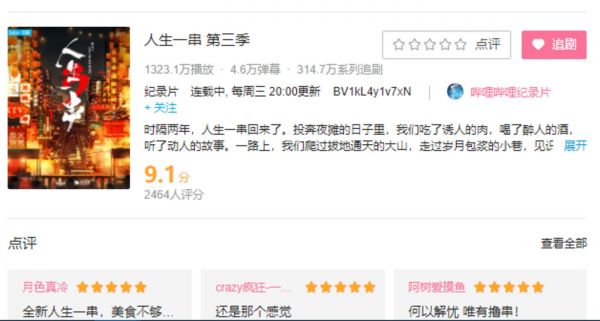 就在发布第三季度业绩的当天,B站自制的美食纪录片《人生一串3》正式开播。不到12小时,第一集的播放量已经超过1200万。