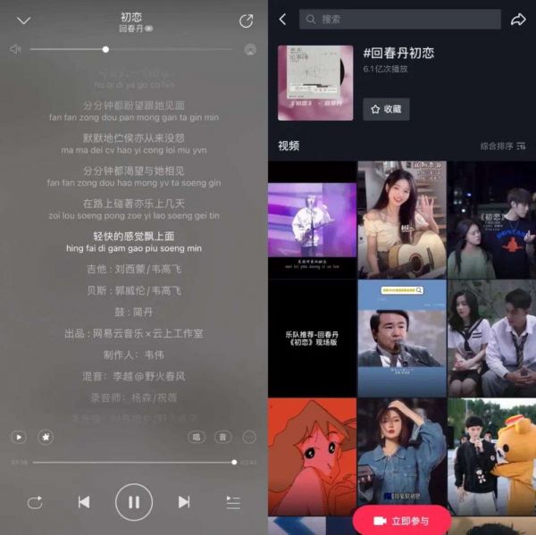 例如,除了《漠河舞厅》《天上飞》等不少作品同时在音乐平台和短视频平台广受欢迎外,网易云音乐自制企划“恋恋记事簿”中,回春丹乐队翻唱的《初恋》,发布不到三个月在网易云音乐累计播放量就已过亿,评论超过3.2万,抖音歌曲使用量13.5万,抖音歌曲话题播放量超6亿。