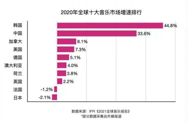 放眼全球市场,据IPFI数据显示,中国录制音乐市场的规模已接近韩国,且在全球十大市场中以33.6%的增速仅次于韩国;而亚洲最大区域市场日本在流媒体的冲击下,2020年录制音乐市场营收同比下降2.1%,“实体孤岛”的神话恐难再续写。