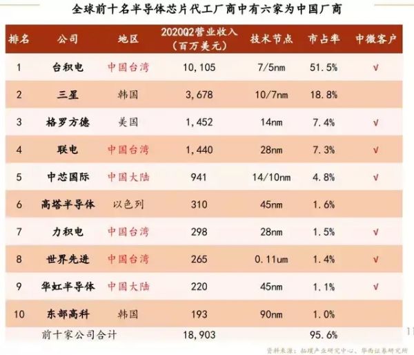 2020年Q2季度,全球前十名半导体芯片代工厂商合计市场份额达95.6%,呈现高度集中的态势。在前十名的公司中,中微拿下了七家公司,合计市场份额高达73.9%。