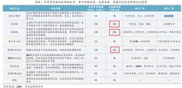 纵观整个半导体前道设备产业链,刻蚀机、光刻机和薄膜沉积设备是市场占比较高的三大细分行业,分别占整个市场的25%、22%和22%。