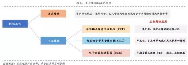 刻蚀工艺共有两条技术路线,分别是湿法刻蚀和干法刻蚀。目前湿法刻蚀由于各向异性较差,所以应用较少,干法刻蚀成为半导体产业的主流技术。干法刻蚀又分为电容耦合等离子体刻蚀(简称CCP)、电感耦合等离子体刻蚀(ICP)两种主流路线。