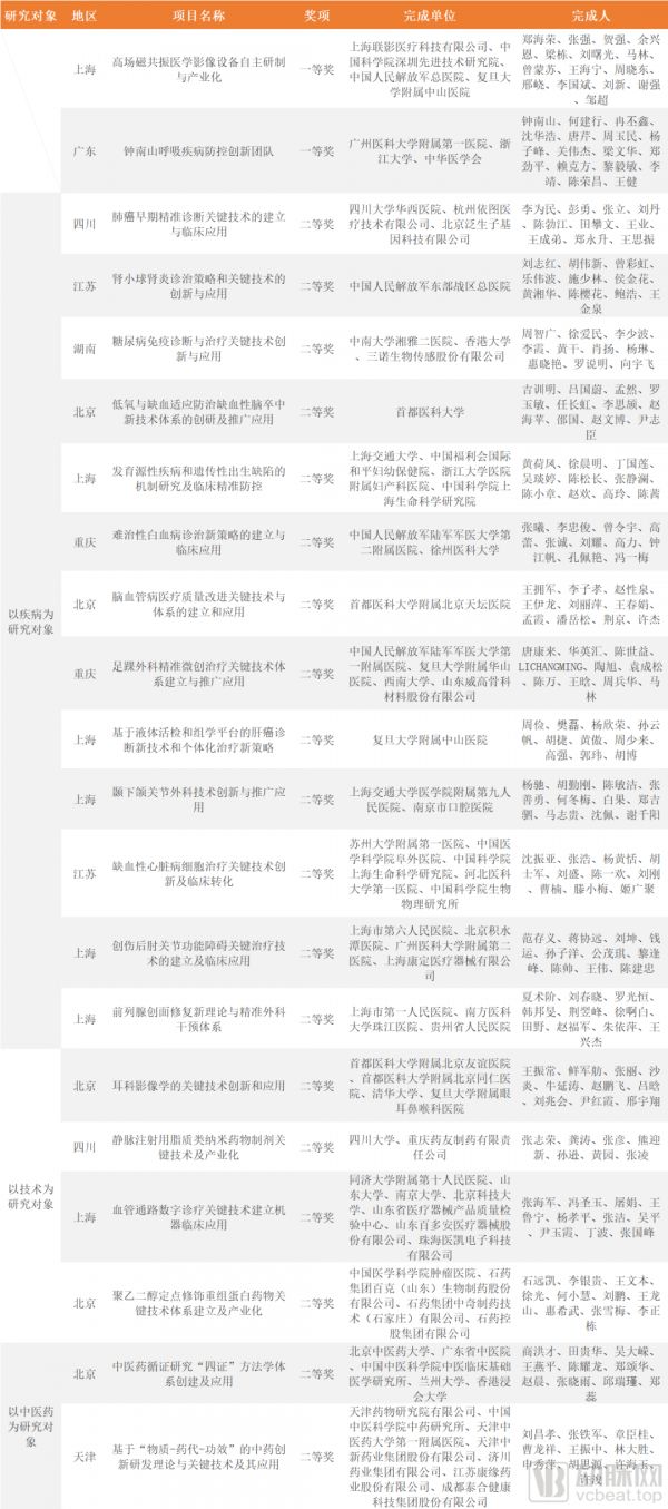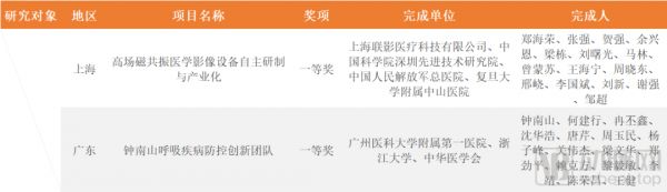从数据来看,获得国家科学技术进步奖一等奖的医疗领域项目共有两个,包括一个创新团队,钟南山呼吸疾病防控创新团队;一个医疗器械项目,“高场磁共振医学影像设备自主研制与产业化”,这也是21个项目中唯一一个第一完成单位为民营企业的项目。