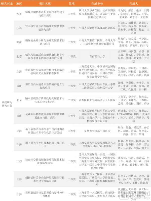 其中一等奖2项,包含一个创新团队;二等奖9项,涉及癌症、脑卒中、缺血性心脏病、肿瘤、糖尿病、肾炎、遗传性出生缺陷、白血病、前列腺增生等疾病领域。动脉网对这21项获奖项目进行了统计分析。