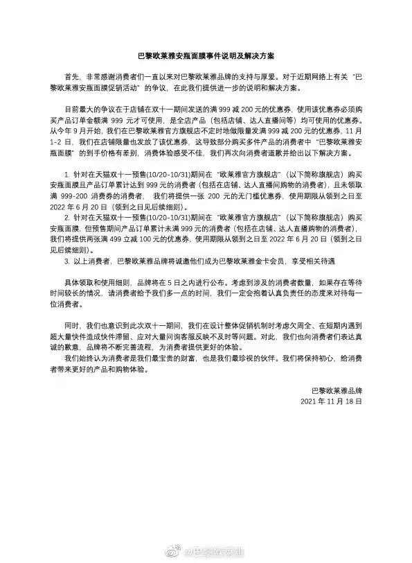 两位头部主播发声后的11月18日凌晨2点后,巴黎欧莱雅发布声明,表示此次事件是因为“繁琐复杂的销售机制”,并对消费道歉,将会提出妥善解决方案。这份声明也被网友吐槽为废话文学的代表,“回应了好像有没有回应,道歉了好像又没有道歉。”