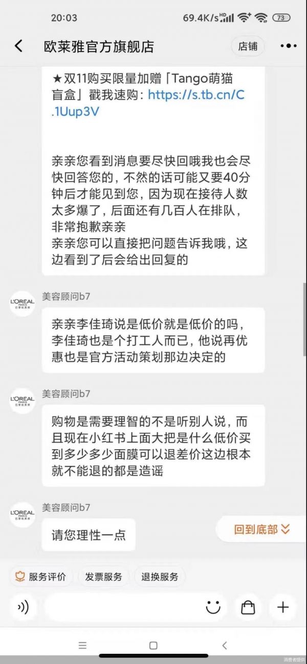 同时,巴黎欧莱雅的客服回复更让此事火上浇油。在李佳琦直播间购买此面膜的消费者,找到巴黎欧莱雅客服,客服却回复道,“李佳琦说是低价就是低价的吗,李佳琦也是个打工人而已,他说再优惠也是官方活动策划那边决定的”。客服还提到,“差价根本不可能退。”