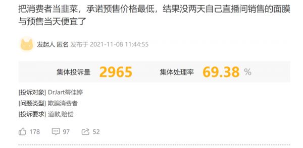 也正如李康说的那样,这样的例子在前几日就出现过。有消费者表示,双十一期间在李佳琦直播间370元购入10盒蒂佳婷面膜。官方宣称,是全网最低价。但是,在11月2日,有消费者发现,蒂佳婷旗舰店发放大额券,5盒同款面膜最低到107元。其他消费者表示,在薇娅直播间购买的蒂佳婷面膜也是如此。这引发消费者极大不满,在黑猫投诉集体投诉热榜上,蒂佳婷投诉数量近3000条,位于巴黎欧莱雅之下,排名第二。