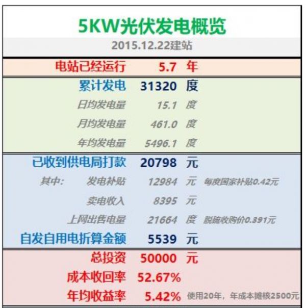 我们可以来算一笔账,一般1kW光伏发电系统,可用于家庭照明、电视、电脑的使用;3kW光伏发电系统可满足一家3口人的生活用电需求,特别是厨房用电;5kW光伏发电系统可以满足一家5口人的需求。
