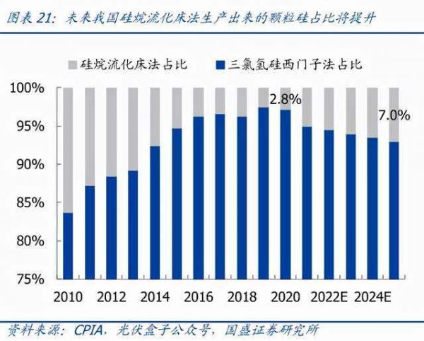 据《中国光伏产业发展路线图》数据,2020年改良西门子法生产的多晶硅占我国97.2%以上的市场份额,而硅烷流化床法颗粒硅占比仅2.8%。