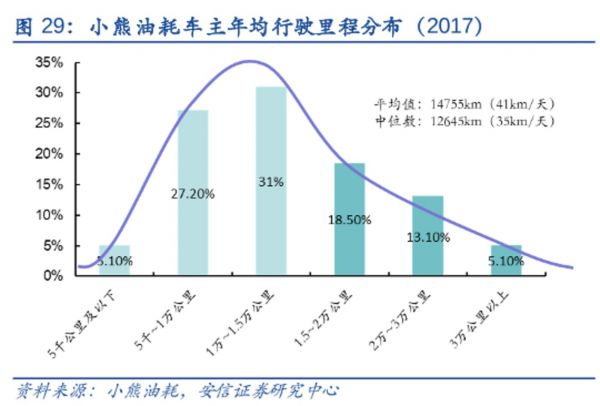 拆解数据,无非是汽车规模和单车行驶里程。单车行驶里程一般在一定范围内波动,据小熊油耗(用户主要为私家车车主)数据测算,中国家庭用车行驶里程分布呈正偏态(中位数、众数小于平均数), 58.2%分布于年均0.5~1.5万km(对应15~40km/天)区间,右侧长尾人群即1.5万km(对应40km以上/天)占36.7%。