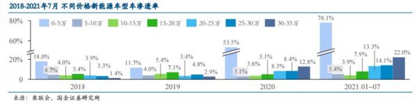 现阶段,整个智能汽车行业的大发展并未真正到来。2018年至今,新能源车渗透率快速增长的是汽车价格带的两端,可以看到,0-5万和30-35万价格带渗透率高,20-30万渗透率正逐步提升,但盘踞我国更大市场份额的5-15万价格带渗透率极低。