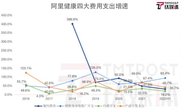 上述对新业务的探索及已有业务的加持也进一步推高了阿里健康报告期内的开支数额。其销售及市场推广开支为9.84亿元,同比增长93.4%,费用率10.5%,增速高于过去两个财年,费用率高于过去4个财年;其产品研发开支为3.23亿元,同比增长40.7%,费用率3.4%,高于过去两个财年。