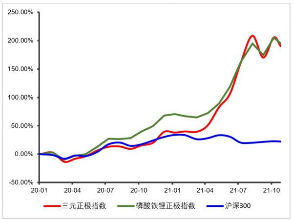 作为成本占锂电池生产成本的40%,同时也是占比最大部分的正极材料板块,市场表现也十分强势,动力锂电池的正极材料主要是三元正极材料和磷酸铁锂正极材料,这两个板块表现均大幅超过大盘。截止目前,两个板块较2020年初涨幅均接近200%;2021年初至今两板块也均有大幅涨幅,其中磷酸铁锂正极材料板块较2021年初涨幅超过67%,三元正极材料板块较2021年初涨幅超过97%。
