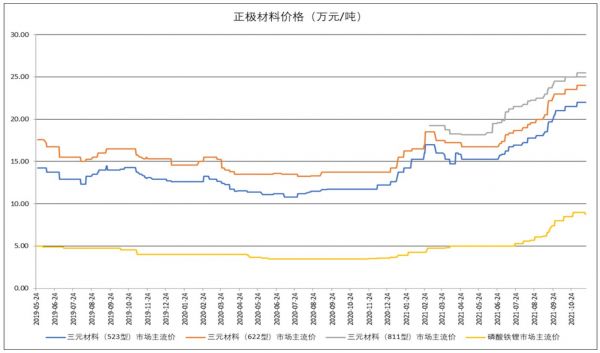 正极材料直接决定动力电池性能,受下游旺盛需求价格涨幅较大