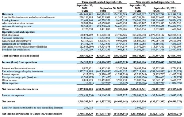 整体来看,灿谷2021年第三季度的总收入为8.01亿元(1.24亿美元),较2020年同期的4.35亿元增长84.1%,高于管理层之前的预期。根据介绍,收入增长主要源于车交易服务业务量和汽车贷款促成业务量的增长。