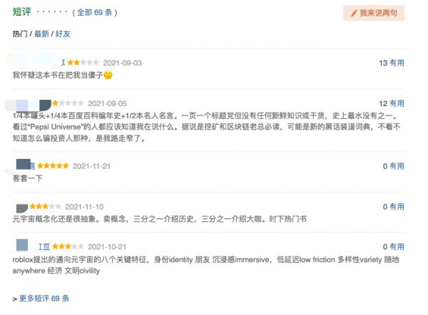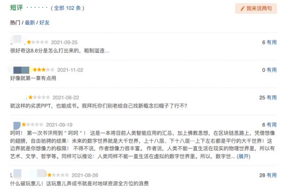 在豆瓣上,《元宇宙》《元宇宙通证》评价更是两极。《元宇宙》最大的槽点是资料拼凑,《元宇宙通证》的高赞评论表示,“1/4本噱头+1/4本百度百科编年史+1/2本名人名言。一页一个标题党但没有任何新鲜知识或干货,史上最水没有之一”。