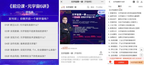 根据课程目录来看,市面上的元宇宙课程思路相似,主要围绕“元宇宙是什么”、“需要的技术逻辑是什么”、“普通人能怎么参与”展开。