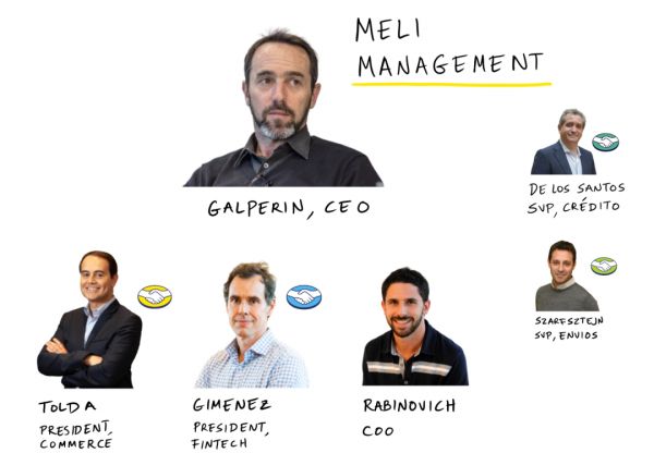 除了加尔佩林,关键人物还有COO 达拉·拉比诺维奇、斯特里奥·托尔达(Stelleo Tolda 商务总裁)和Osvaldo Gimenez(金融科技总裁)。托尔达一开始是巴西分公司总经理,一路晋升到COO,现在是公司基石部门的总裁。同样,拉比诺维奇从工程师做起,后来担任了CTO,并领导了“新世界”的改造。