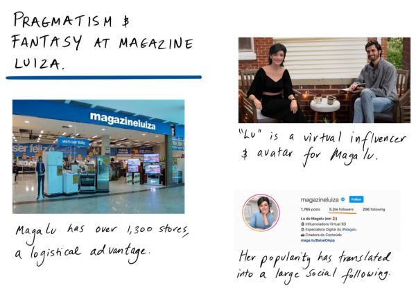 如果Shopee是巴西的新生儿,Magazine Luiza便是老对手。成立于1957年,Magalu原是一家连锁零售店,后来成功转向全渠道发展,在其业务范围中增加了线上业务。在某些方面,过去十年里Magalu和Meli背道而驰,前者加强了其虚拟地位,而后者则加强了其实体地位。即使以更重的资产模式运营,Magalu在2020年的净收入为55亿美元,超过了Meli。有趣的是,在营销上,Magalu选择了与虚拟偶像Lu合作。Lu相当于巴西电商的Lil' Miquela。在其帮助下,Luiza在Instagram上拥有520万粉丝,而Mercado Libre只有290万粉丝。