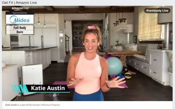 (健身教练凯蒂·奥斯汀在AmazonLive上直播自己的锻炼过程。在直播期间,她会休息一下,宣传赞助品牌的除湿机。在视频下方,她使用的产品(例如安德玛鞋)的链接会在屏幕上滚动/图源:亚马逊直播)
