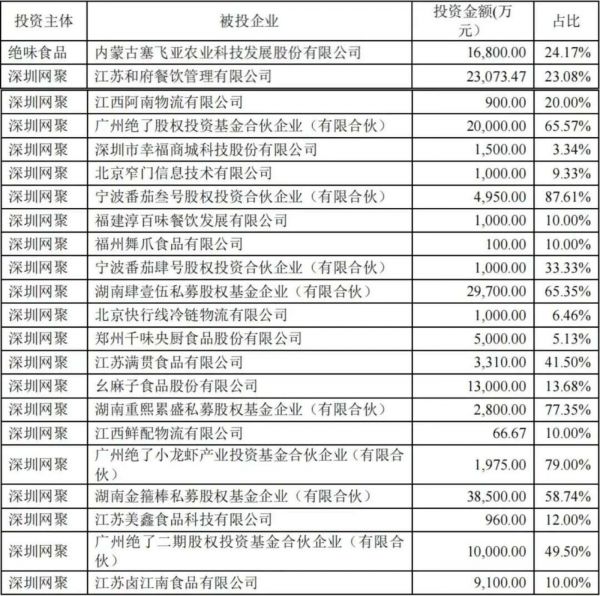此后,网聚及旗下绝了基金又接连投资了幸福西饼、蛙来哒、犟骨头、很久以前、霸蛮等餐饮品牌,以及幺麻子等后端产业链企业,甚至还包括窄门等数据平台。而直接以绝味食品投资的预制菜企业千味央厨,则于今年9月在深交所上市……