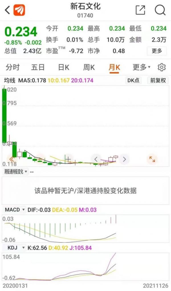 然而,新石文化上市仅半月,便跌穿0.5港元招股价。截至2021年11底,新石文化已经较上市后最高价跌去77.55%,较发行价跌了54.20%。