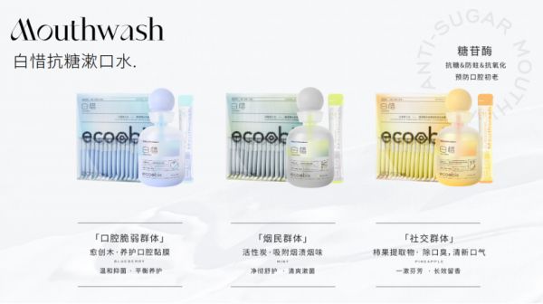 目前,白惜漱口水已经推出面向口腔脆弱群体(蓝莓口味)、烟民群体(薄荷口味)、社交群体(凤梨口味)三款产品。除了通过糖苷酶实现抗糖、防蛀、抗氧化功效,三款漱口水,还分别加入了愈创木提取物、活性炭、柿果提取物来达到养护口腔黏膜、吸附烟渍烟味、除口臭清新口气的功效。