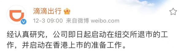钛媒体快讯|12月3日消息:滴滴出行通过官方微博宣布,经认真研究,公司即日起启动在纽交所退市的工作,并启动在香港上市的准备工作。