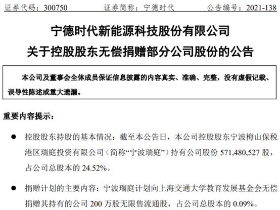 12月3日晚间,宁德时代发布《关于控股股东无偿捐赠部分公司股份的公告》,称接到控股股东宁波梅山保税港区瑞庭投资有限公司通知,为支持教育事业发展,宁波瑞庭计划向上海交通大学教育发展基金会无偿捐赠其持有的公司200万股股票,占宁德时代总股本0.09%。按宁德时代最新收盘价687元/股计算,这一笔捐赠对应市值高达约14亿元。