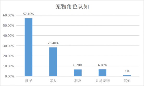 宠物承载着人们的情感寄托。在宠物角色认知中,大部分人把宠物当成家庭成员来对待。依据观研天下整理的数据, 57.1%的人把宠物视为孩子,28.4%的人视为亲人。