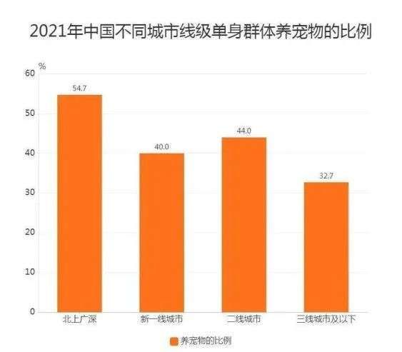 而中国单身经济的崛起,也助推了宠物市场的发展。 越来越多的单身人士愿意养宠物来降低生活的孤独感,这一现象在一、二线城市尤为普遍。数据显示,2021年,北上广单身群体养宠物的人数占比54.7%,居城市第一。其次是二线城市养宠物的单身群体,占比44%。而在所有养宠物的人群里,未婚者占57%。