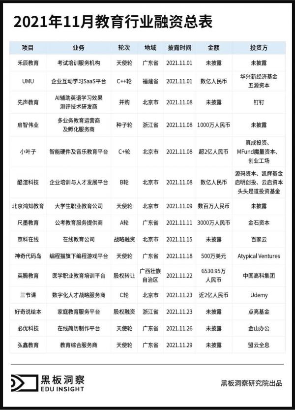 11月教育行业融资报告:15家企业共融资11.03亿元,后期融资比例提升明显