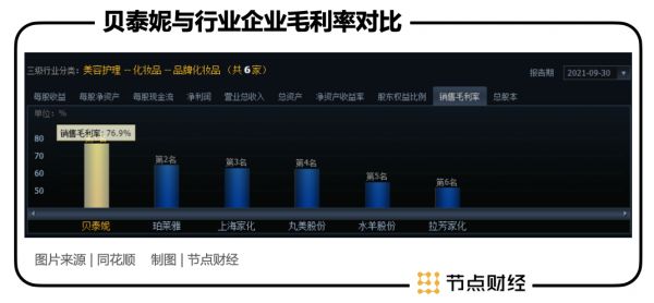 相比普通化妆品,薇诺娜这种皮肤学级护肤品具有更高的科技含量,相应的附加值较高,产品的毛利率也相当客观。今年公司三季报显示,贝泰妮销售毛利率达到76.9%,远高于珀莱雅、上海家化、丸美等综合类化妆品厂商。