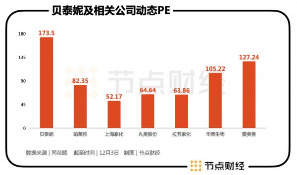 从估值角度看,即便目前贝泰妮已回撤超过30%,其173.5倍(12月3日)的动态PE仍显得有些高。相比之下,A股其他化妆品公司如珀莱雅、上海家化、完美股份等目前估值均在100以下。稍微扩展一下,隔壁同样被资本市场寄予厚望的医美概念股如华熙生物、爱美客等,其动态PE也和贝泰妮有一定的差距。
