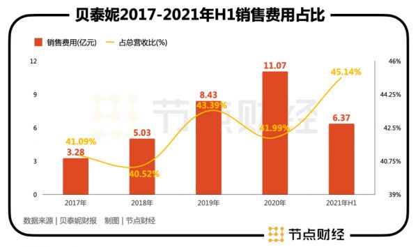 而相比研发投入,贝泰妮的销售费用占比却在逐年走高。2021年前三季度,贝泰妮销售费用为9.78亿元,同比增长46.83%,营收占比约为46%。2017年至2021年上半年,贝泰妮的销售费用占当期营业收入比例分别为41.09%、40.52%、43.39%、41.99%和45.14%。