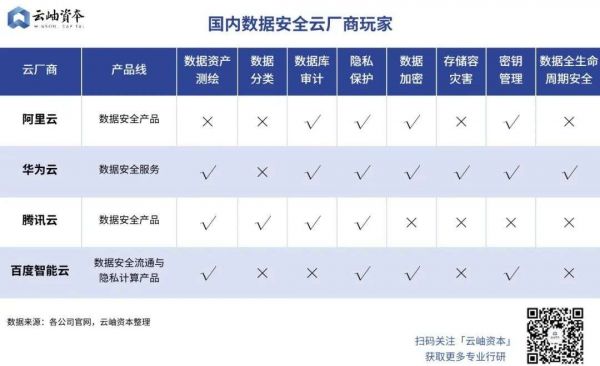 云厂商:以提供云基础设施配套的基础安全产品为主。以下是目前几大云厂商提供的数据安全产品比较。