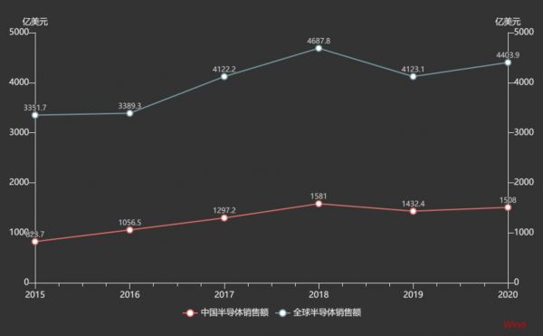 由于美国对中国半导体行业进行制裁,中国半导体市场的销售额从2015年开始的连续增长出现首次下降,同时拖累了全球半导体市场销售额的增长。中国半导体市场的销售额从2015年的823.7亿美元增长至2018年的1581亿美元,2020年销售额反而较2018年下降至1508亿元;全球半导体市场销售额由2015年的3351.68亿美元增长至2018年的4687.78亿美元,2020年销售额较2018年下降至4403.89亿美元。