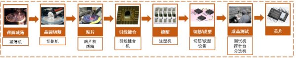 后道的封测主要包括封装和测试两个环节,封装过程包括背面减薄、晶圆切割、贴片、引线键合、模塑和切割成型,对应的所用到的半导体设备包括减薄机、切割机、贴片机和注塑机以及切割成型设备;测试环节在封装环节之后,主要用来测试产品的功能和性能,主要用到测试机、探针机和分选机等设备。