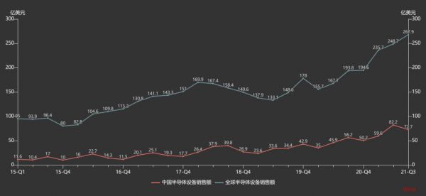 半导体设备作为半导体产业链上游核心环节之一,是半导体制造行业的基石,同时也对上千倍自身产值的下游电子信息行业的发展起到放大作用,2021年全球及中国半导体设备销售额均出现大幅增长,2021年1-9月全球半导体设备市场销售额达到752.3亿美元,同比增长45.5%,中国市场半导体设备销售额达到214.5亿美元,同比增长56.5%。