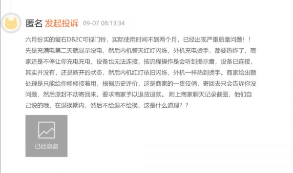 据黑猫投诉平台显示,不少网友也因遭遇产品质量问题向萤石网络发起投诉维权。一网友表示其购买了一款萤石网络旗下的可视门铃,仅使用了2个月便遇到诸多产品质量问题,如机器烫手和无法正常连接设备等。