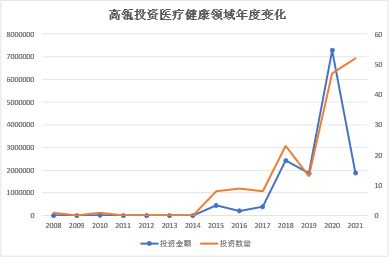 据CVSource投中数据整理可知,从2008年至今,高瓴在医疗健康领域持续加码,呈快速上涨趋势,直至2020年达到峰值。
